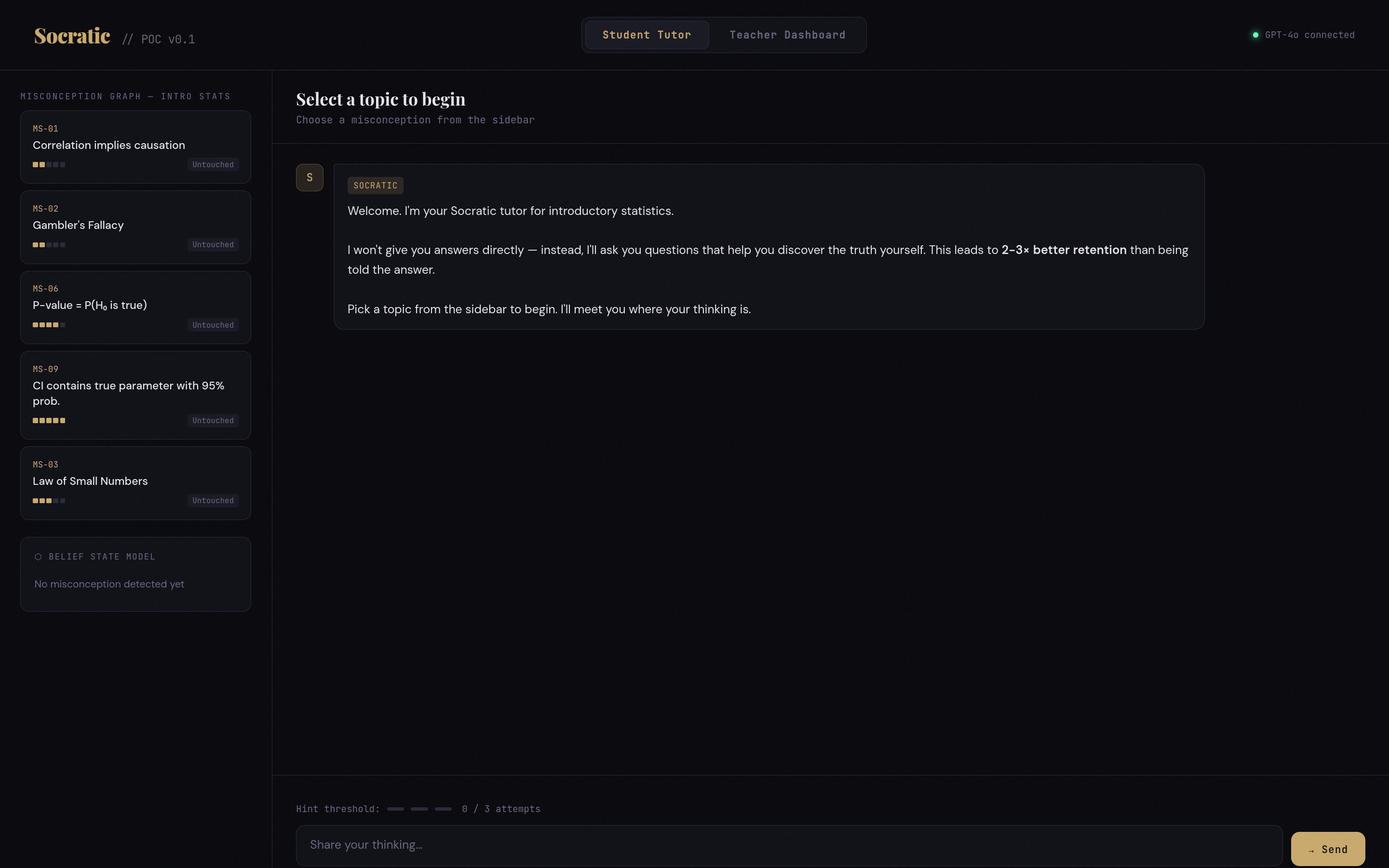 This is simpler than a misconception graph and I think it actually works better in practice for a hackathon scope, at least. The LLM is good at detecting when reasoning is wrong. The tagging system just forces it to respond in a way that uses that detection without short-circuiting the studentâs thinking process. The behavior you get is recognizably Socratic, even if the underlying mechanism is less elegant than pre-built research-validated sequences.