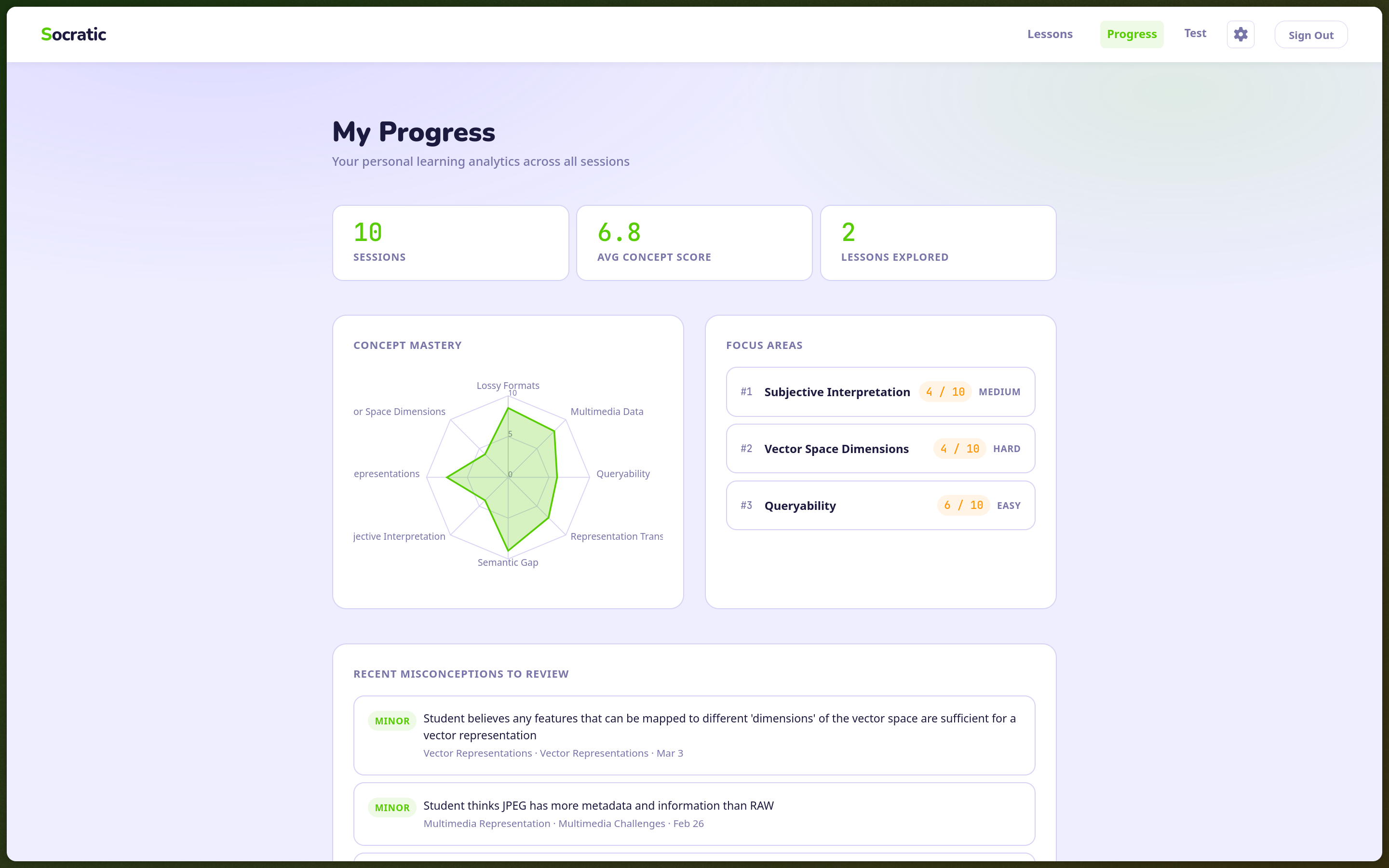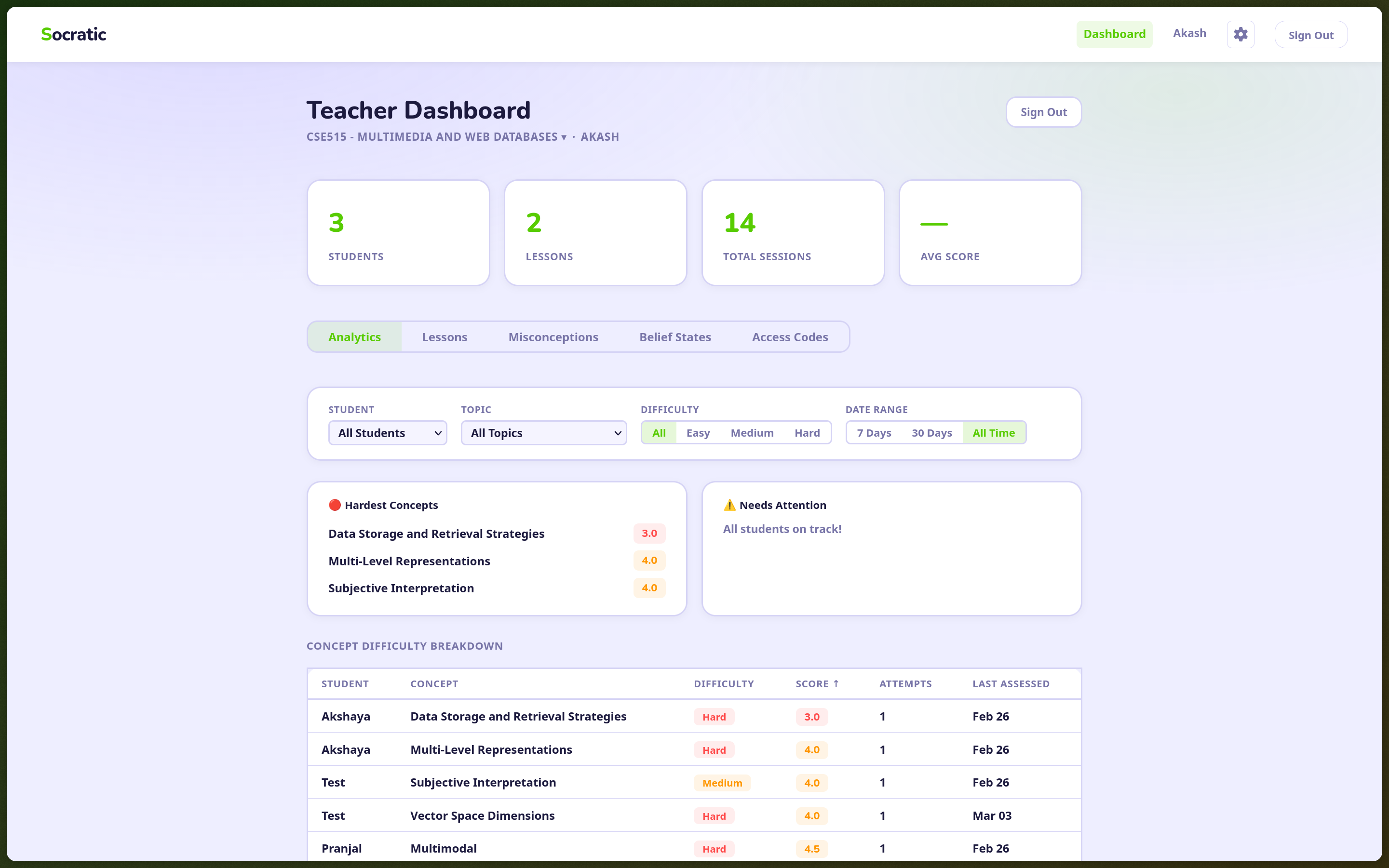 Teachers see, in real time, which concepts students are struggling with and which misconceptions are forming. Not â30% of students got question 4 wrongâ, but specific wrong beliefs, categorized and tracked per student. The dashboard pulls from Supabase Realtime, so as sessions complete, the teacherâs view updates live. They can filter by student, by lesson, by concept. They can see which misconceptions are shared across the class and which are isolated.